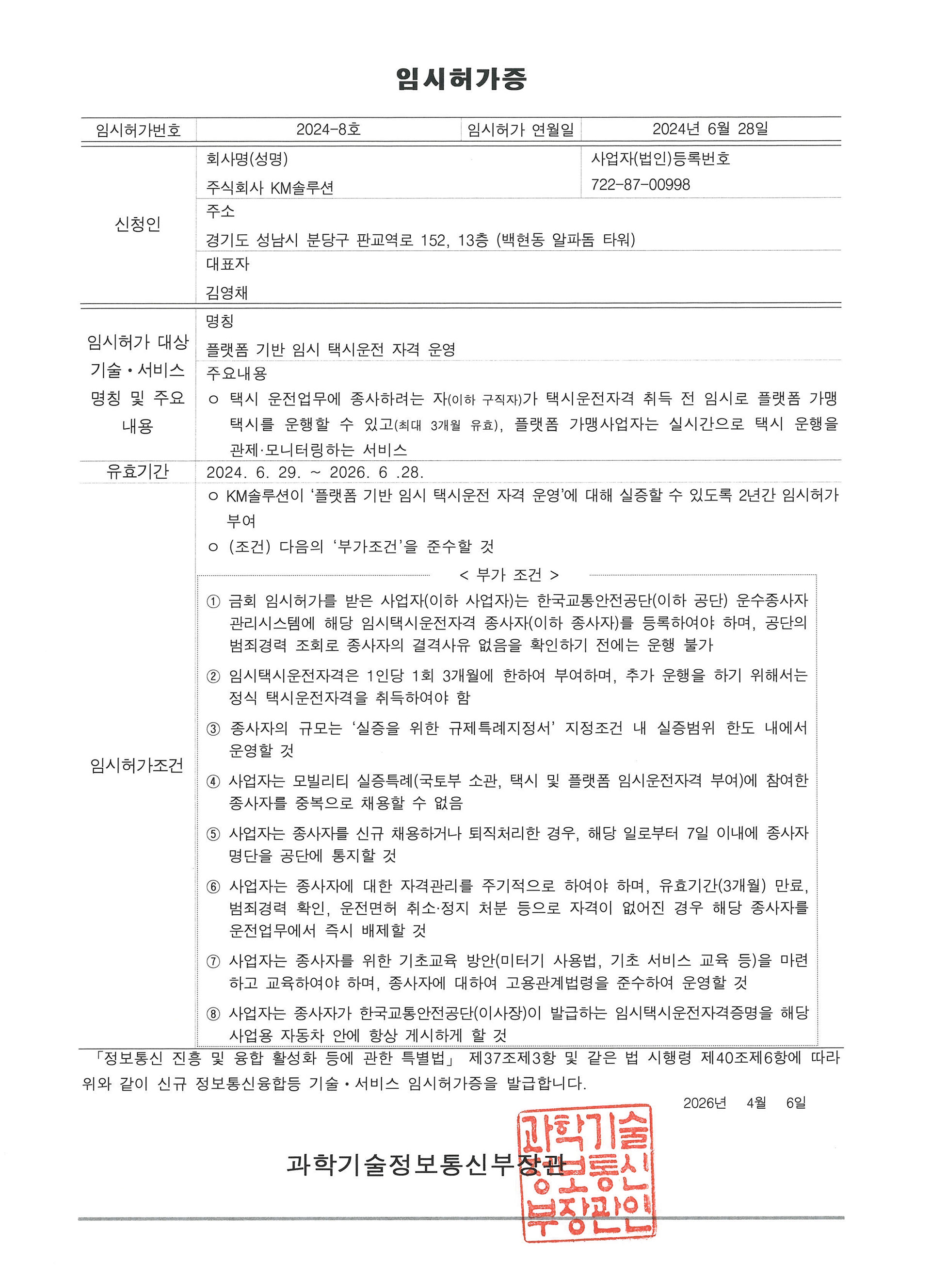플랫폼 기반 임시 택시운전 자격 운영(KM솔루션)